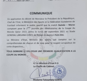 CONAKRY- la décision vient de tomber, le match qui va opposer la Guinée au Maroc lundi 6 septembre prochain en éliminatoires du mondial...