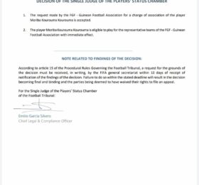 La FIFA a validé le changement de nationalité sportive de Moriba Kourouma. Elle a adressé un courrier à la fédération guinéenne de...