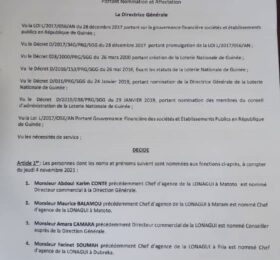 Dans une décision datant du 2 novembre dernier, la Directrice générale de la Loterie Nationale de Guinée (LONAGUI), Aminata Sylla a...