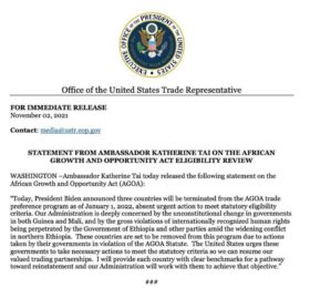 Le président Biden a annoncé ce mardi que trois pays dont la Guinée, seront suspendus de son partenariat commercial (AGOA) en...
