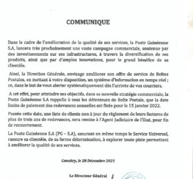 Dans un communiqué, le directeur général de La Poste Guinéenne Mohamed Sita Cissé a rappelé aux détenteurs de boite postale que la...