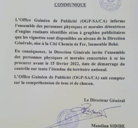 Dans un communiqué, le directeur général de l’Office guinéen de Publicité (OGP) invite les personnes physiques et morales...