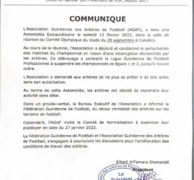 CONAKRY- L’Association guinéenne des arbitres de football vient d’annoncer la fin de leur mot d’ordre de grève lancé il y a...
