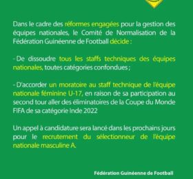 Conakry- Dans un communiqué rendu public ce vendredi, le Comité de Normalisation de la fédération guinéenne de Football annonce la...