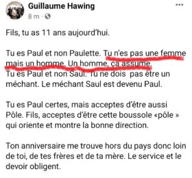 Le ministre Guillaume Hawing a fait un post à l’occasion des 11 ans de son garçon. A celui-ci, il a dit : Tu es Paul et non Paulette....