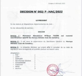 CONAKRY- C’est à travers une décision officialisée ce mercredi que le président du Horoya AC Soufiane Souaré a annoncé la...