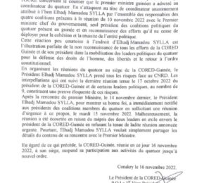 La CORED de Mamadou Sylla, suspend sa participation au sein du quatuor (Raisons)
