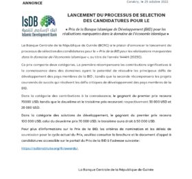 La Banque Centrale de la République de Guinée (BCRG) a le plaisir d’annoncer le lancement du processus de sélection des candidatures...