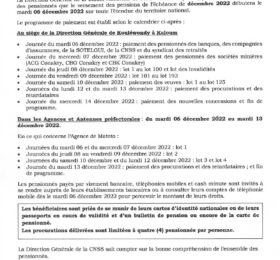 La Direction Générale de la Caisse Nationale de Sécurité Sociale (CNSS) porte à la connaissance des pensionnés que le versement des...