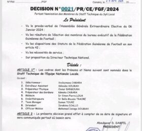 CONAKRY- Dans une décision prise ce jeudi 25 avril, la fédération Guinéenne de Football a annoncé la composition du nouveau staff...