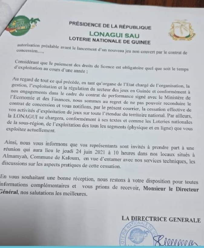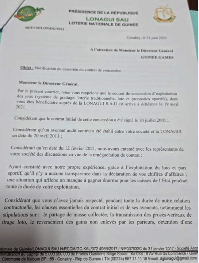 La LONAGUI S.A.U a notifié à GUINEE GAMES la cessation effective de toutes ses activités d’exploitation de jeux sur toute I ‘étendue du territoire national. La Loterie nationale de Guinée n’a pas renouvelé le contrat arrivé à expiration, parce qu’elle reproche, entre autres faits, à la société appartenant à Antonio Souaré- en tout cas jusqu’à recemment-, un manque de transparence dans la déclaration des chiffres d’affaires. Selon nos informations, la société doit près de 200 milliards de GNF à l’Etat guinéen.