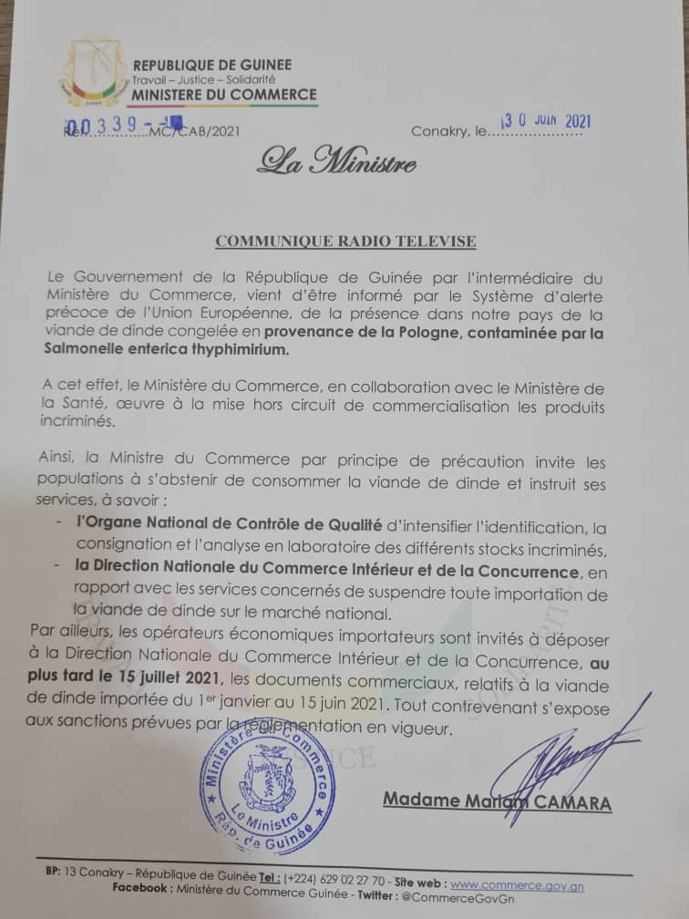 Le ministĂšre du Commerce a dans un communiquĂ© dit avoir Ă©tĂ© saisi par le systĂšme dâalerte de lâUnion europĂ©enne de la prĂ©sence en GuinĂ©e de la viande de dinde congelĂ©e en provenance de la Pologne, contaminĂ©e par la âSalmonelle enterica thyphimiriumâ