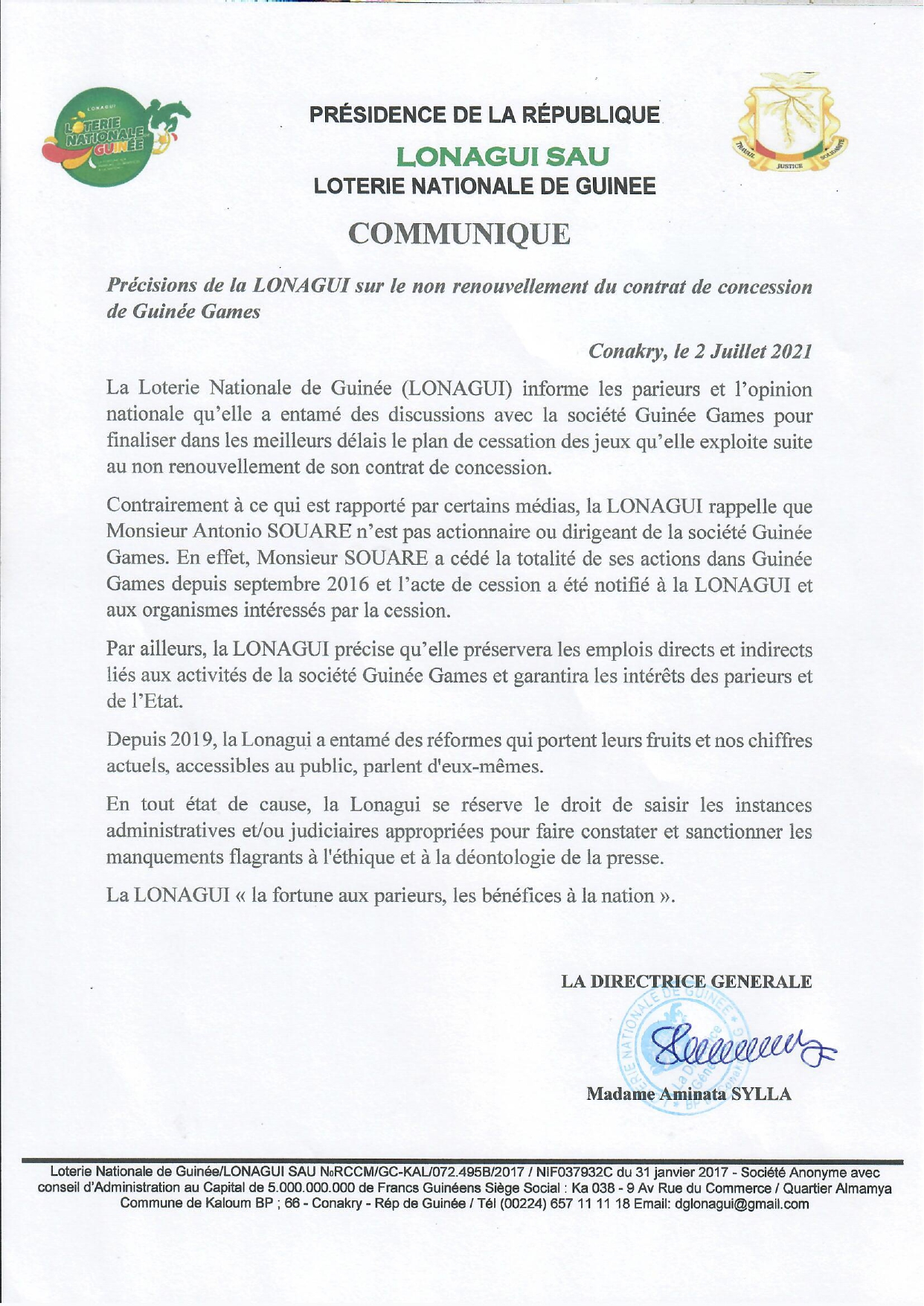 L’article La LONAGUI rappelle qu’Antonio Souaré n’est pas actionnaire ou dirigeant de Guinée Games et s’engage à préserver les emplois directs et indirects est apparu en premier sur Guinee7.com.