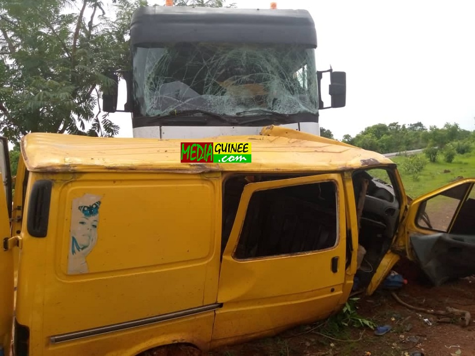 En partance pour la Moyenne Guinée, un camion remorque de couleur blanche transportant du maïs et du haricot a violemment percuté un minibus de couleur jaune immatriculé RC-8569 U transportant 5 personnes à son bord.