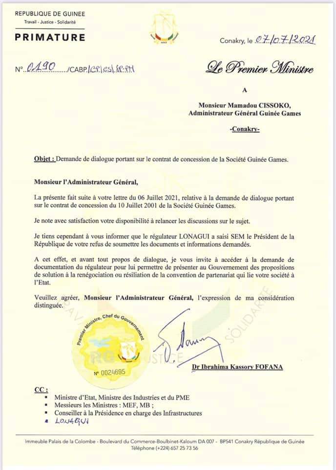 Dans le dossier qui oppose la Lonagui à Guinée Games, le Premier ministre est sorti de son mutisme. Dans une correspondance adressée à Mamadou Cissoko, Administrateur général de Guinée Games, Ibrahima Kassory Fofana invite la société à soumettre toute la documentation nécessaire à la Lonagui en vue d’une solution de l’affaire.