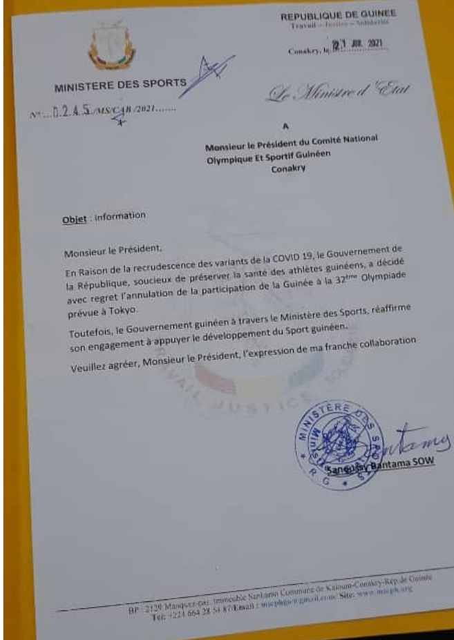 Nous venons de l’apprendre. Pour des raisons sanitaires liées au Coronavirus, la délégation guinéenne n’ira pas au Japon où les 32e Jeux Olympiques démarreront officiellement ce vendredi 23 juillet 2021 à Tokyo..