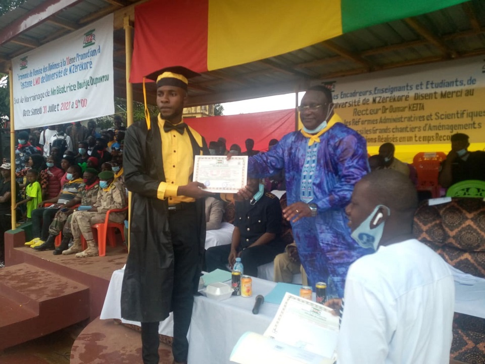 Dr Oumar Keita, le recteur de l’Université de N’zérékoré, fera remarquer ceci dans son intervention : « aujourd’hui, comme vous pouvez le constater, notre université connaît de profonds changements depuis notre nomination en octobre 2019. Ces résultats sont le fruit d’un travail acharné et collectif par tous les dirigeants de l’Université. C’est aussi avant tout le fruit de la bonne politique en faveur des jeunes de Son Excellence le président de la République, le Professeur Alpha Condé qui a fait confiance à la jeunesse pour diriger l’Université de N’zérékoré. Chers étudiants sortants, l’Université vous félicite pour votre parcours universitaire. Vous avez fait preuve de responsabilité. Vous serez bientôt sur le marché de l’emploi. Je vous souhaite bonne chance. Et je vous demanderai de garder un lien solide avec l’Université, car vous faites partie désormais de cette université. Cependant ne perdez jamais de vue l’État dans votre formation. Vous avez un devoir de reconnaissance à l’État, aux collègues enseignants-chercheurs et personnels administratifs de l’Université. »