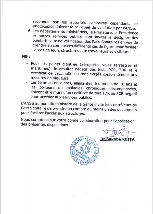 Dans cette lettre, il est précisé que ” le Pass Sanitaire est l’ensemble des documents sanitaires retenus par le ministère de la santé en collaboration avec le conseil scientifique pour apprécier l’État de santé de toute personne résidant en Guinée en cette période de Covid-19″.