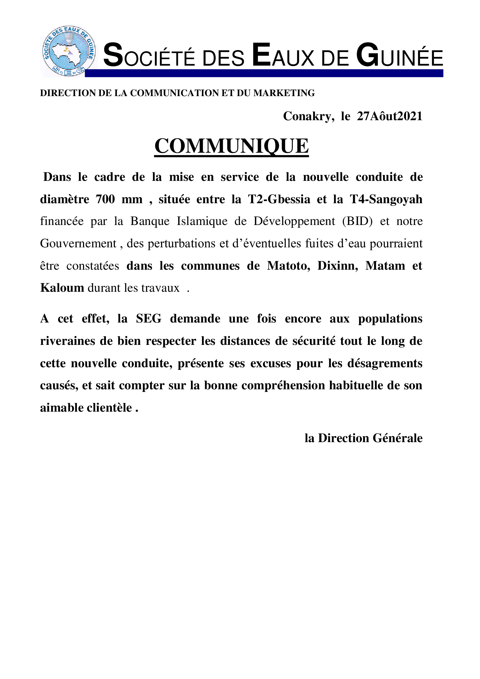 A cet effet, la SEG demande une fois encore aux populations riveraines de bien respecter les distances de sécurité tout le long de cette nouvelle conduite, présente ses excuses pour les désagrements causés, et sait compter sur la bonne compréhension habituelle de son aimable clientèle .