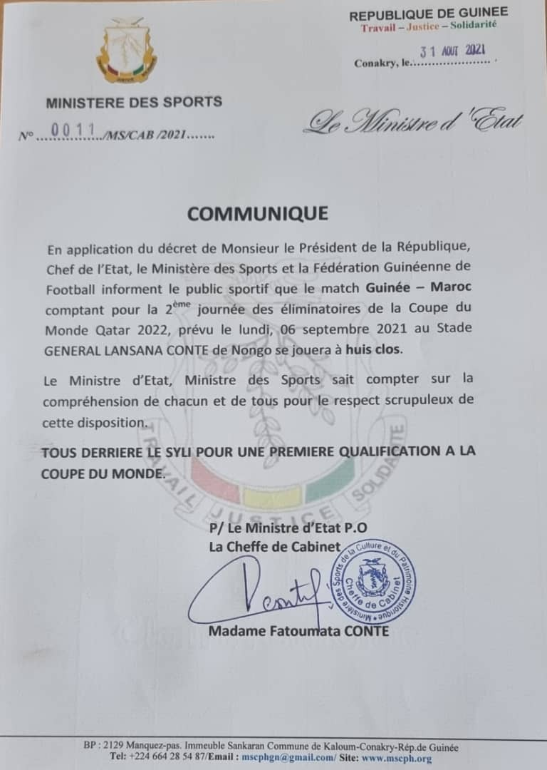 CONAKRY- la décision vient de tomber, le match qui va opposer la Guinée au Maroc lundi 6 septembre prochain en éliminatoires du mondial 2022, se jouera sans le publics.