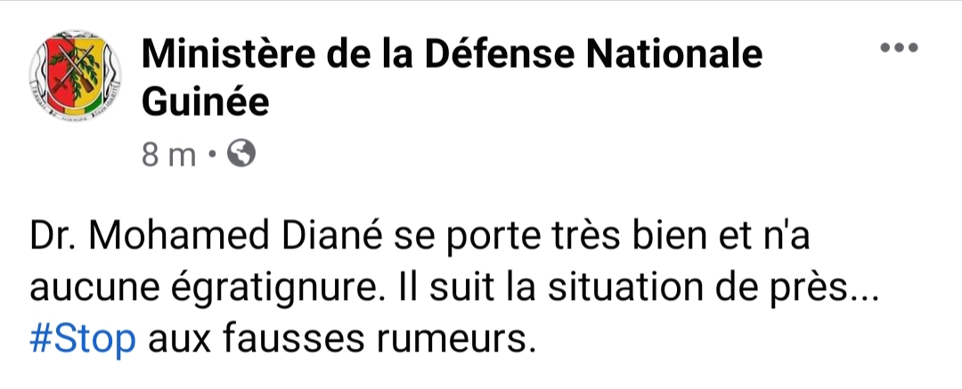 “Dr. Mohamed Diané se porte très bien et n’a aucune égratignure. Il suit la situation de près… #Stop aux fausses rumeurs”, annonce le Ministère sur sa page Facebook.