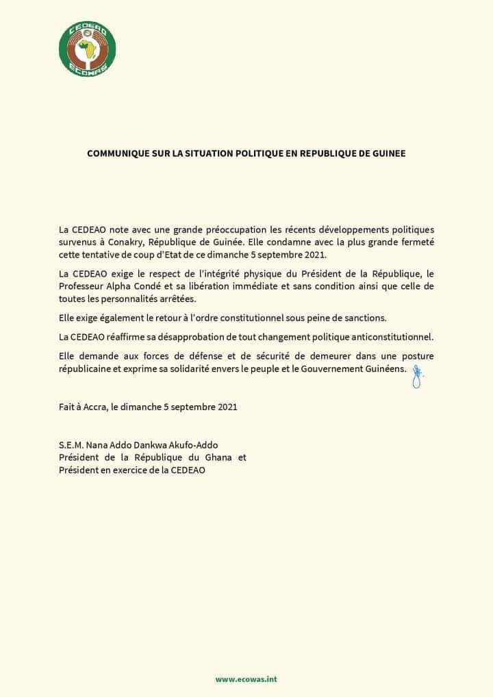 Dans un communiqué dont Mediaguinee détient copie, la Communauté économique des Etats de l’Afrique de l’Ouest (Cedeao) a condamné “la tentative de coup d’État, exigé le respect de l’intégrité physique du président Alpha Condé et sa libération immédiate”