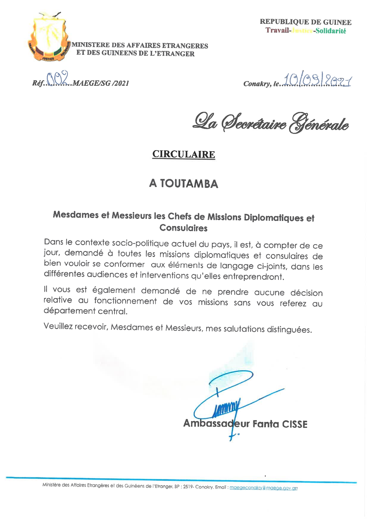Nouveau pouvoir, nouveau langage. Ďans une note de la secrétaire générale du Ministère des Affaires étrangères et des Guinéens de l’étranger Fanta Cissé adressée aux chefs de Missions diplomatiques et consulaires, il est demandé de ne prendre aucune décision relative au fonctionnement de leurs missions sans se référer au département central.
