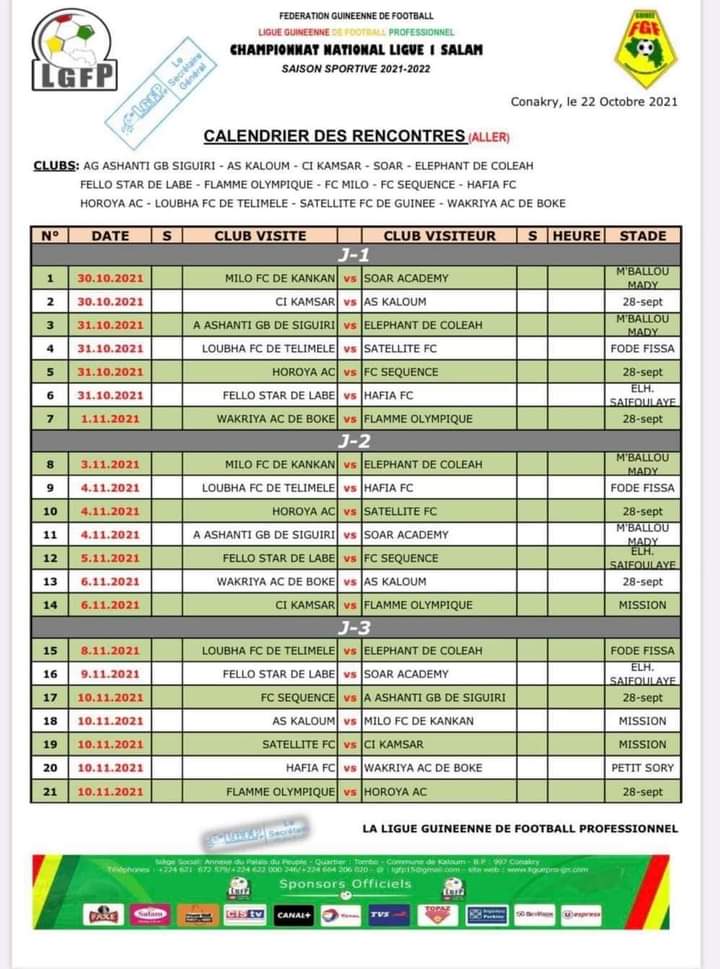 CONAKRY- La saison sportive 2021-2022 de Ligue 1 de Guinée démarre officiellement le dimanche 30 octobre prochain. Pour cette nouvelle saison, le Milo FC de Kankan et le FC Séquence de Dixinn sont les deux promus. La Ligue Guinéenne de Football professionnel (LGFP) vient de dévoiler le calendrier des trois (3) premières journées.