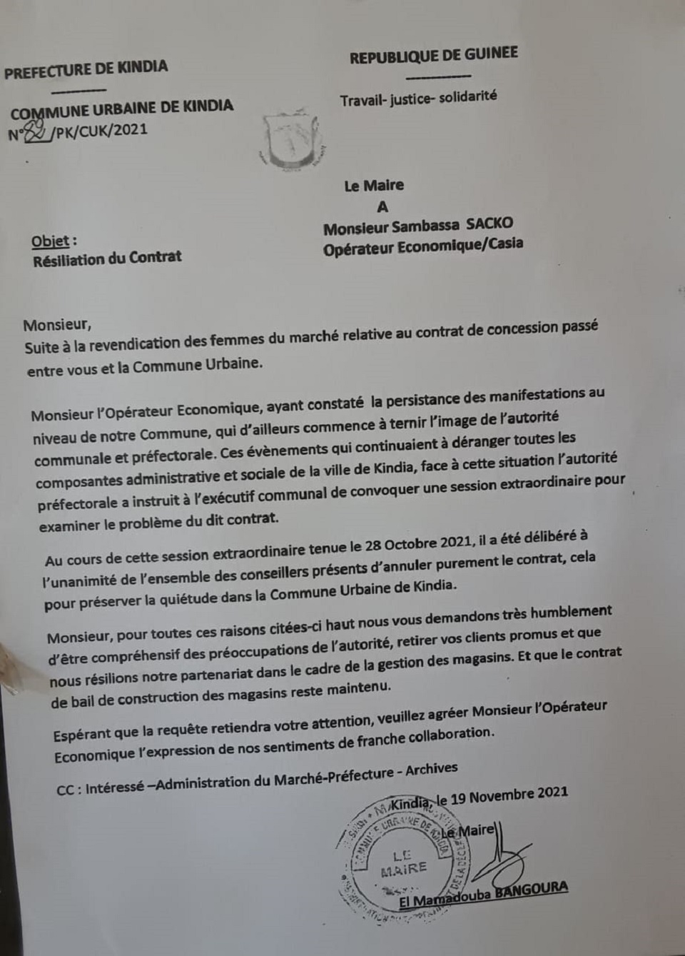 Le bail du marché Wambélé qui a suscité tant de tensions dans la commune urbaine de Kindia vient d’être résilié. C’est une décision prise par l’autorité préfectorale qui a reçu dans son bloc récemment les femmes de ce marché qui manifestaient leur ras-le-bol suite au bail de leur marché. L’acte de cette résiliation a été publié hier vendredi 2021.