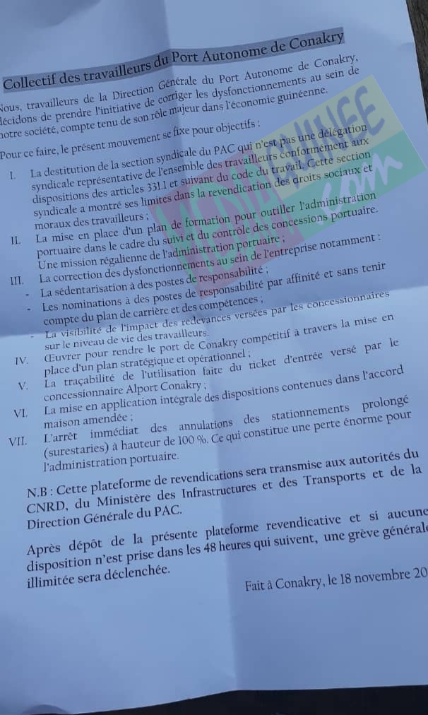 Dans une plateforme de revendications en date du 18 novembre dernier, et qui sera adressée aux plus hautes autorités du pays dont le CNRD et le Ministère des Transports, le collectif des travailleurs du Port Autonome de Conakry décident « de prendre l’initiative de corriger les dysfonctionnements au sein de notre société, compte tenu de son rôle majeur dans l’économie guinéenne. »