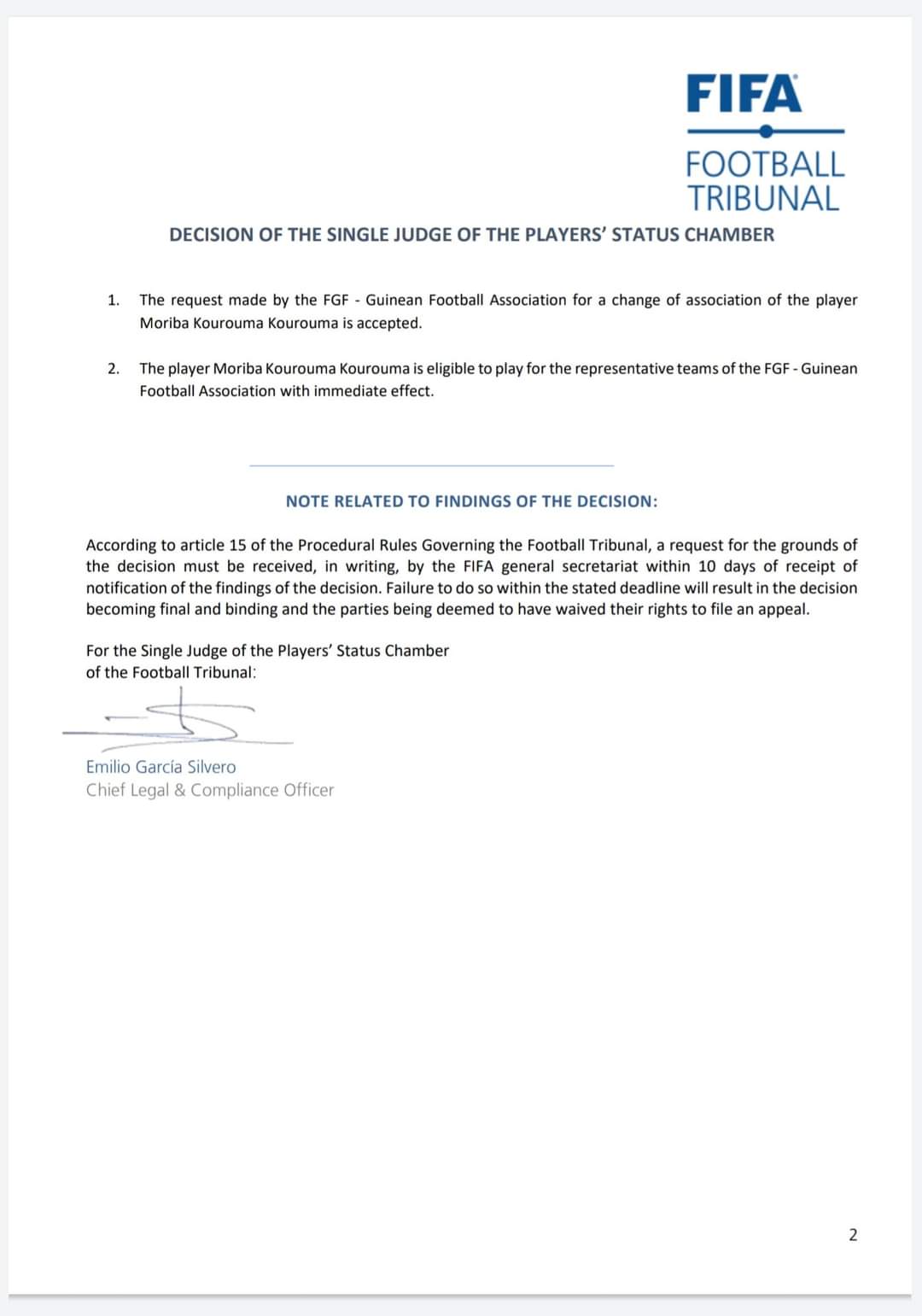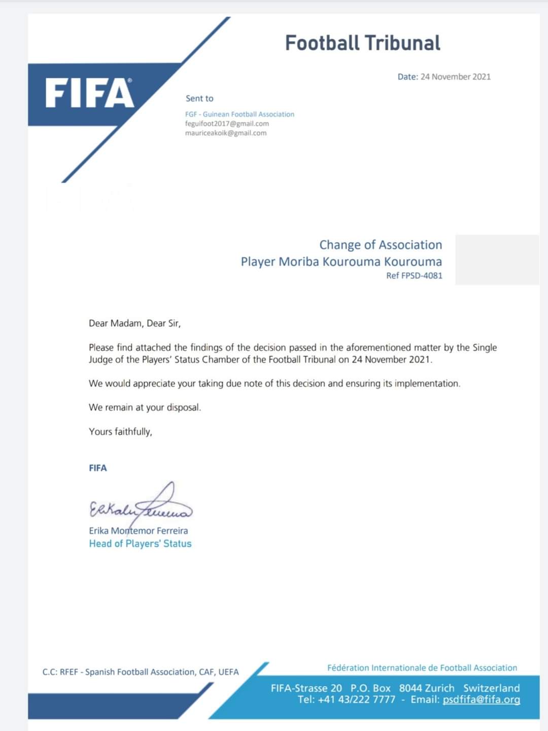 La FIFA a validé le changement de nationalité sportive de Moriba Kourouma. Elle a adressé un courrier à la fédération guinéenne de football à cet effet.