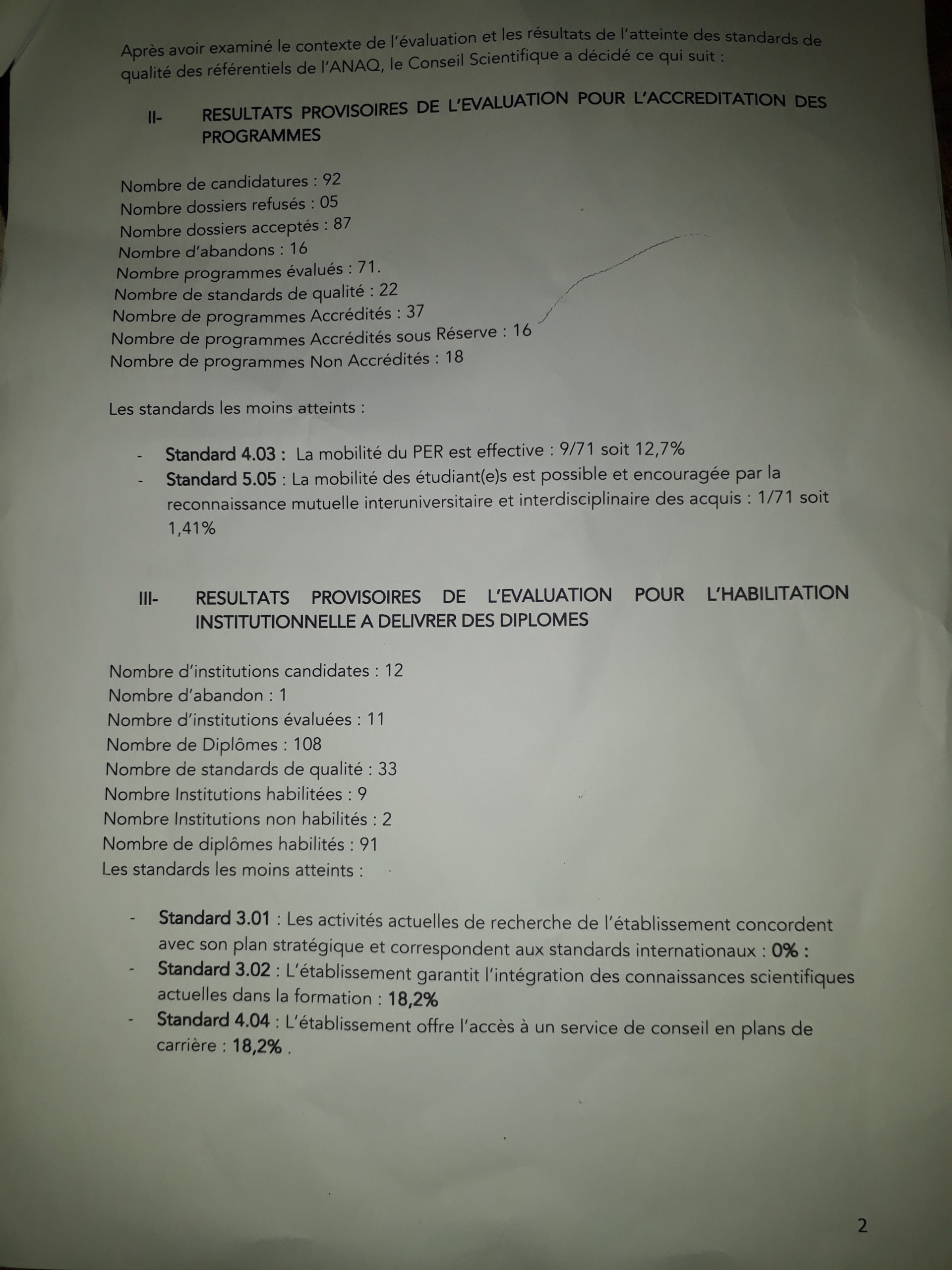 Sur les 71 programmes évalués, 37 ont été accrédités ; 16 ont été accrédités sous réserve ; 18 programmes ont été non accrédités et 22 programmes de standards de qualité.