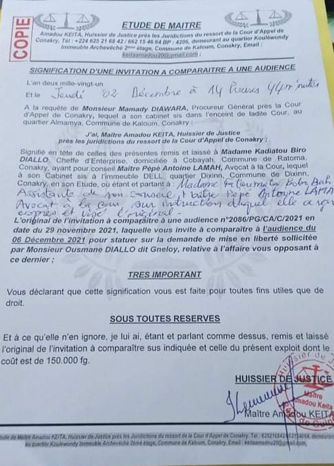 L’affaire Ousmane Gnelloy Diallo vs Kadiatou Biro Diallo « DK » est loin de connaître son épilogue. Alors que l’on croyait le dossier clos avec la condamnation du premier, voilà l’affaire qui revient à nouveau devant le juge. La justice demande la comparution de dame DK à l’audience du lundi, 6 décembre pour statuer sur la demande de mise de liberté sollicitée par Ousmane Gnelloy.