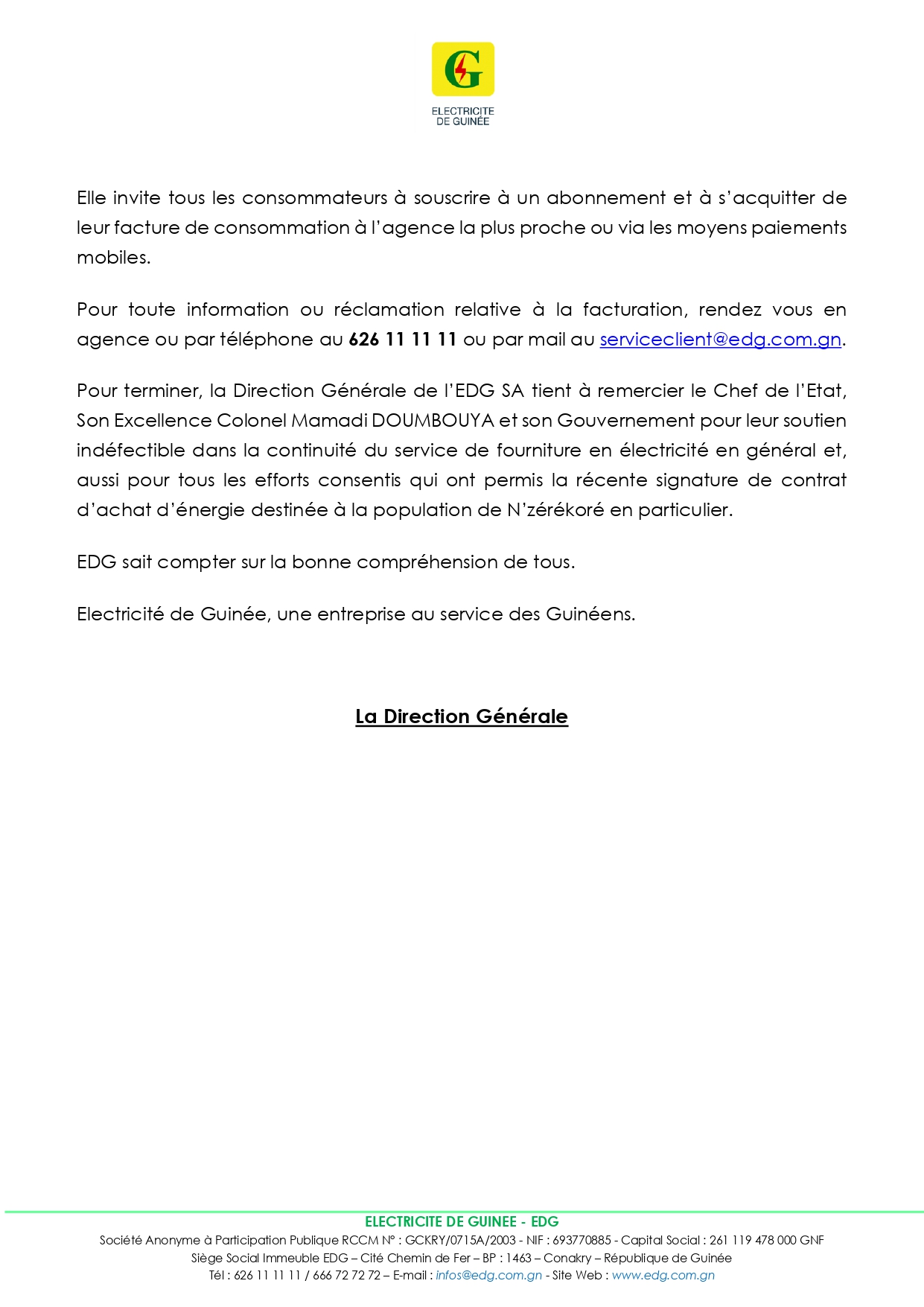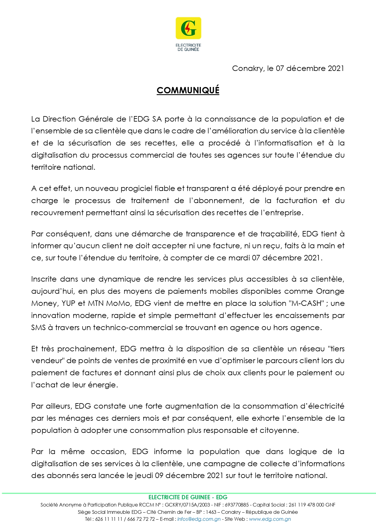 La direction générale de l’Électricité de Guinée (EDG) a annoncé l’informatisation et la digitalisation du processus commercial de toutes ses agences sur toute l’étendue du territoire national. Communiqué…
