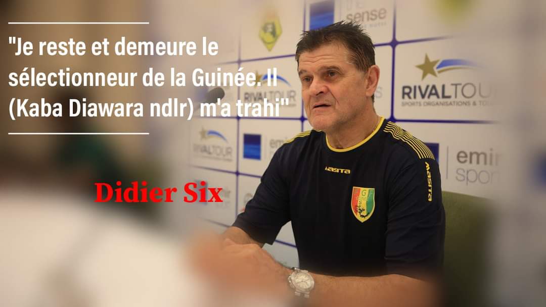 Didier Six dit se sentir trahi par son ex-adjoint : « à la limite, je me sens trahi. Kaba Diawara ne m’a pas appelé sur son voyage sur Conakry. Je pense qu’on a mis tout en place comme un secret d’État. On ne s’est vu qu’une seule fois après les éliminatoires. Il m’a trouvé au bureau de M. Souaré [ancien président de la Fédération guinéenne de football) quand on m’a demandé le bilan sur nos deux premiers matches des éliminatoires du mondial. Vu que nous étions éliminés de cette compétition, j’ai proposé que les deux derniers matches servent de test pour la préparation de la CAN 2021. Je ne suis pas surpris. Il a une fois eu le courage de mettre le micro de Canal+ sur le banc de l’équipe nationale à Bamako pour une émission sans me demander l’autorisation encore moins à la fédération. Mais j’ai voulu gérer la situation pour défendre mon staff. C’est lui qui m’a glissé la peau de banane », a réagi Didier Six chez nos confrères de Conakrysports.