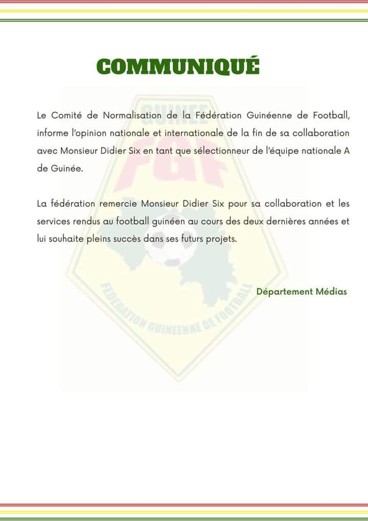 CONAKRY- C’est désormais officiel, Didier n’est plus le sélectionneur du Syli national de Guinée. Alors que le technicien était encore officiellement lié à la Guinée par contrat, le comité de normalisation vient d’annoncer que Didier Six quitte son poste en Guinée.