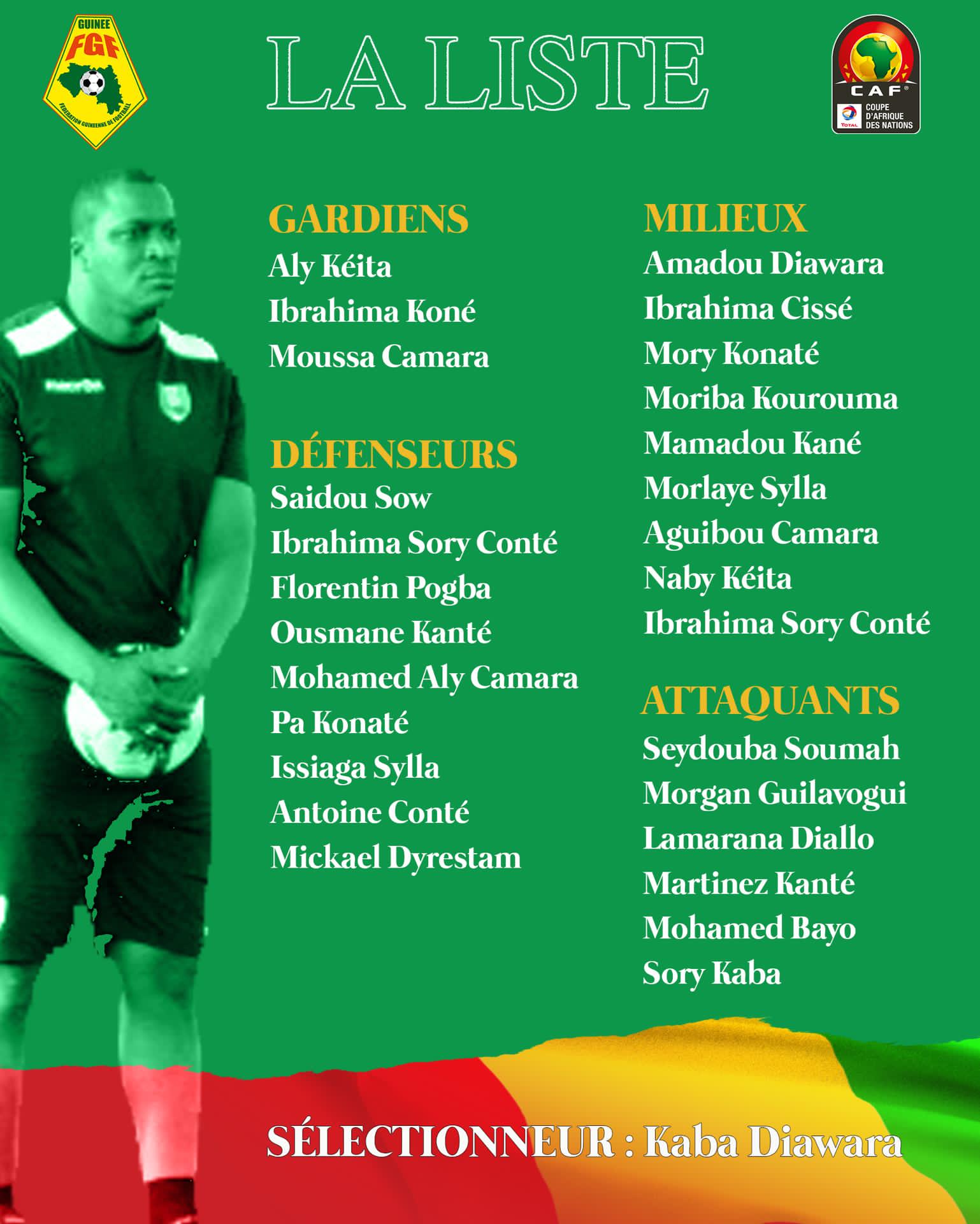 Mory Konaté, Lamara Diallo, Antoine Conté et Moriba Kourouma sont convoqués, et on note le retour du gardien Ibrahima Koné. Par contre, François Kamano et Mady Camara sont les grands de cette expédition au Cameroun.