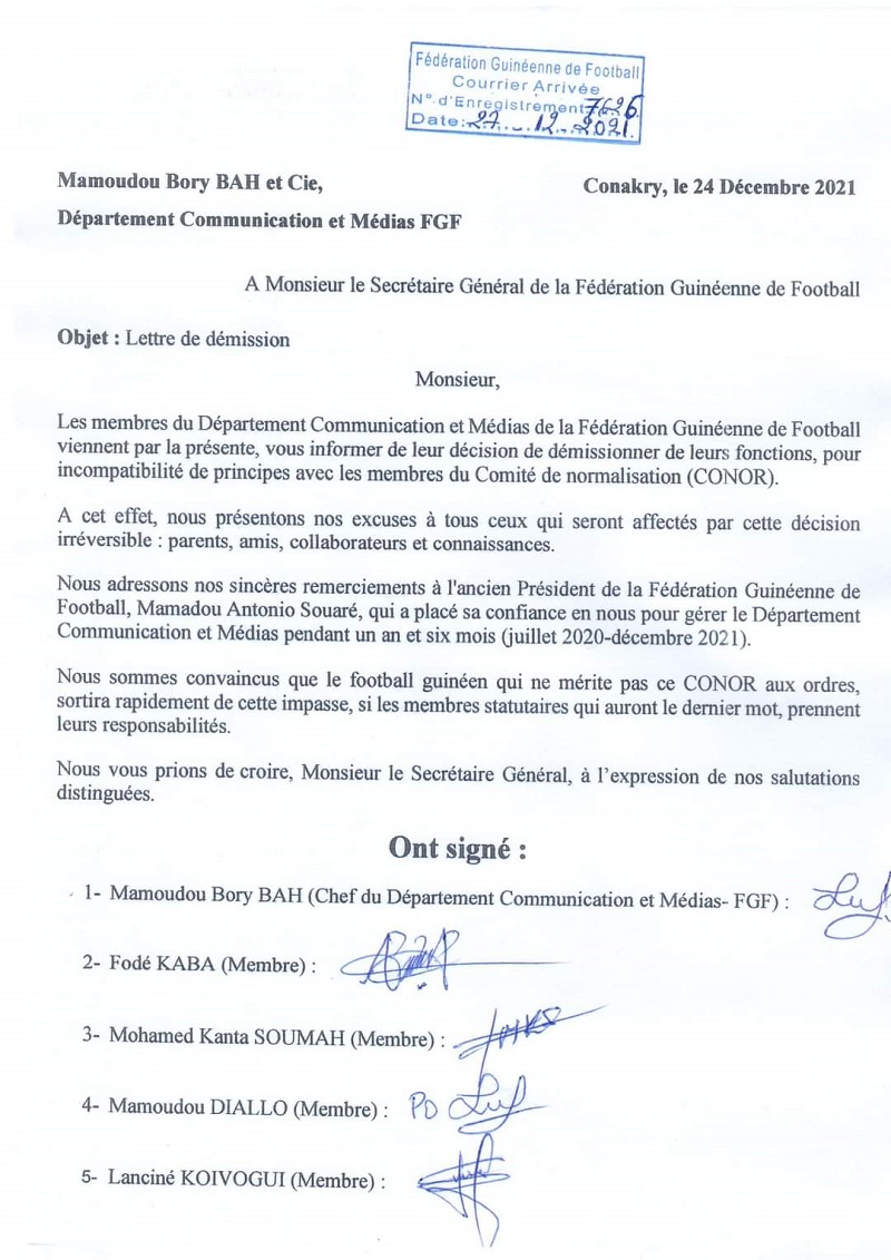 Les membres du Département Communication et Médias de la Fédération Guinéenne de Football (FGF), ont démissionné. Ils l’ont fait savoir à travers une lettre adressée au secrétaire général de la Féguifoot. Lire ci-dessous la lettre.