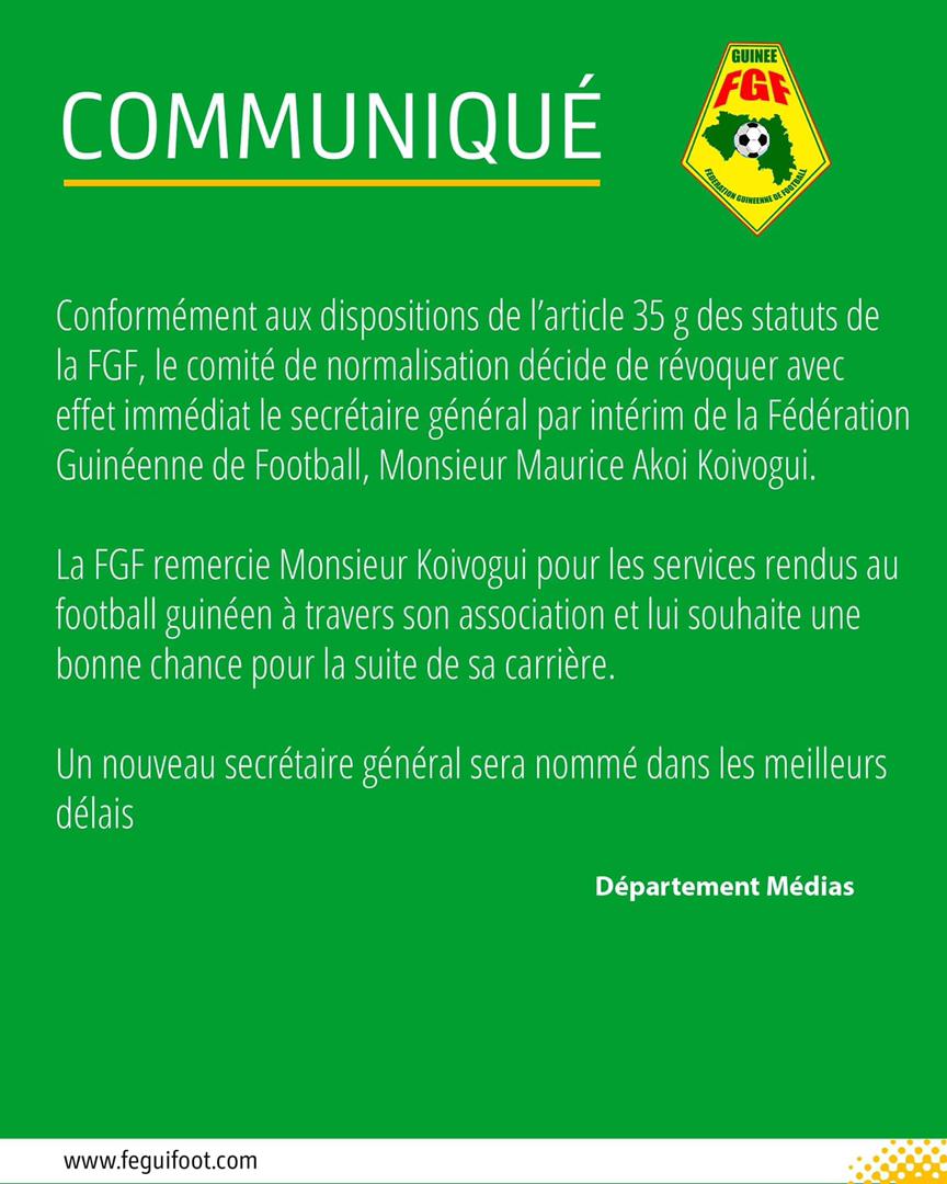CONAKRY- Comme il fallait s’y attendre, le nouveau comité de normalisation, à peine installé à la Fédération Guinéenne de Football vient d’annoncer le départ du Secrétaire Général Maurice Akoi Koivogui.