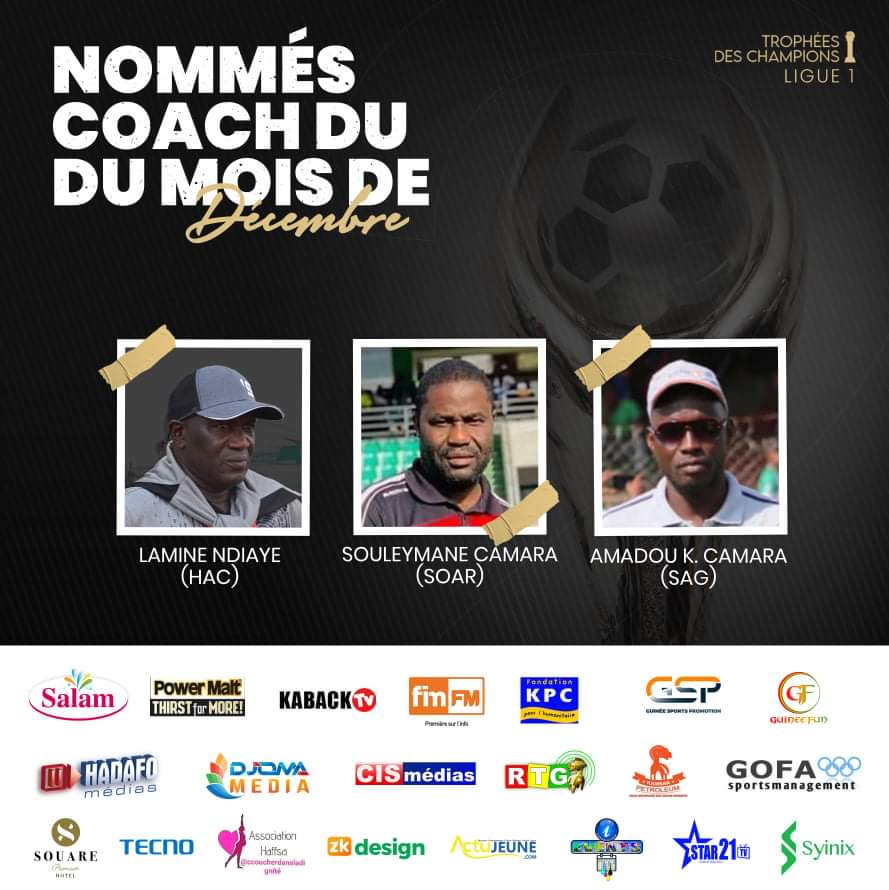 Chez les entraîneurs, on retrouve Souleymane Abedi Camara, excellent avec l’Académie SOAR, actuel leader du championnat guinéen, aux prises avec Lamine N’Diaye du Horoya AC et Amadou Kain Camara de la SAG de Siguiri, nommés pour le trophée « Coach du mois ». Là aussi, le lauréat sera connu le dimanche 2 janvier 2022.