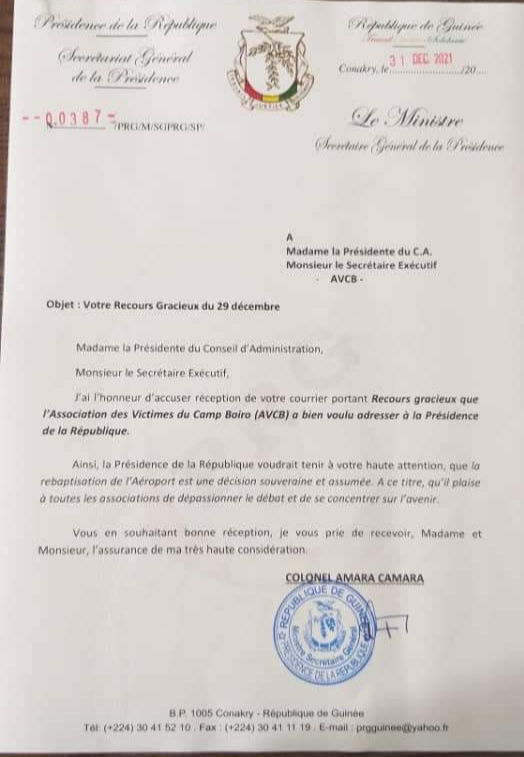 L’Association des victimes du camp Boiro avait écrit au CNRD pour lui demander de revenir su sa décision qui a donné le nom de l’Aéroport de Conakry à feu Ahmed Sékou Touré. C’est « une décision souveraine et assumée », répond le colonel Amara. Lire sa lettre réponse ci-dessous.