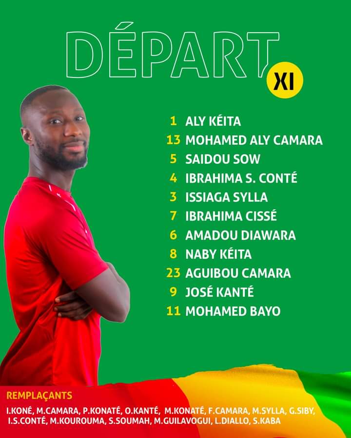 KIGALI- Le sélectionneur du Syli Kaba Diawara vient de dévoiler le 11 de départ de la Guinée contre le Rwanda. Naby Keita est de retour dans l’équipe et est titulaire. Le match démarre à 14h GMT. En défense, Saidou Sow est titulaire aux côtés de Mohamed Aly Camara et Ibrahima Sory Conté. Mohamed Bayo est associé à José Martinez Kanté en attaque.