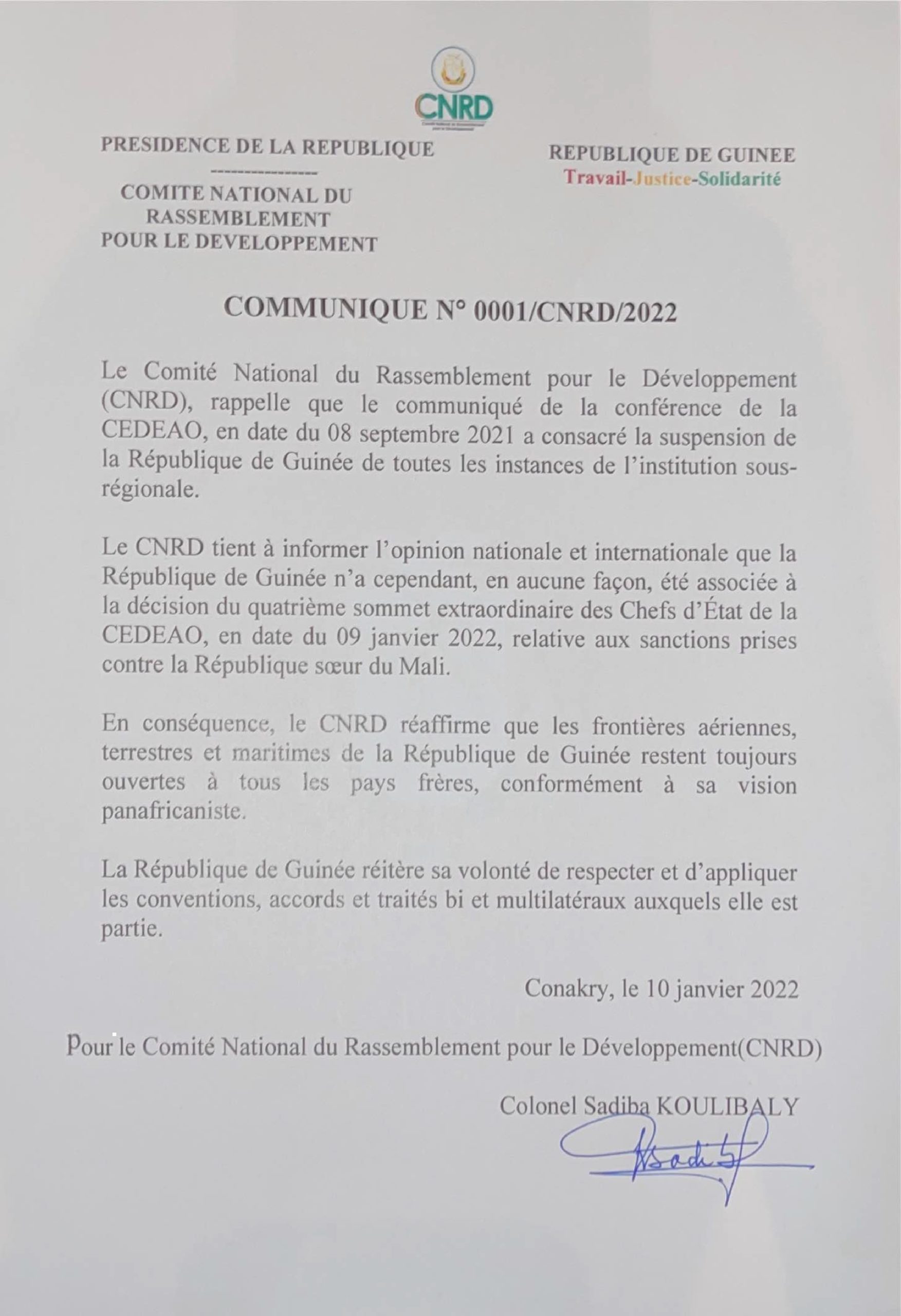 Dans un communiqué, le Comité national du rassemblement pour le développement (CNRD) a indiqué lundi que la Guinée -qui n’a pas été associée aux décisions du dernier sommet de la Cedeao à Accra sur le Mali-gardera ses frontières ouvertes….