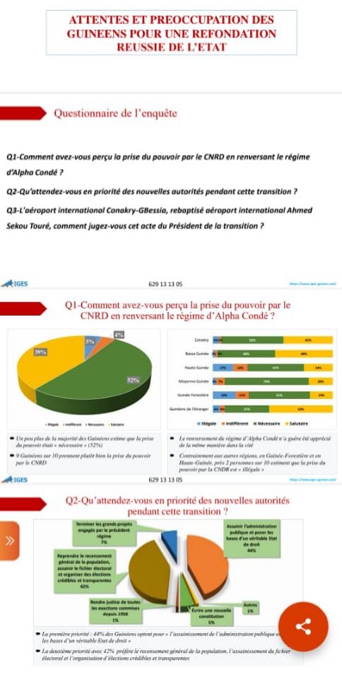 Les résultats de l’enquête de l’IGES prouvent que la majorité des guinéens adoubent le colonel Mamadi Doumbouya et le CNRD qui ont mis un terme au régime d’Alpha Condé, le 05 septembre dernier.