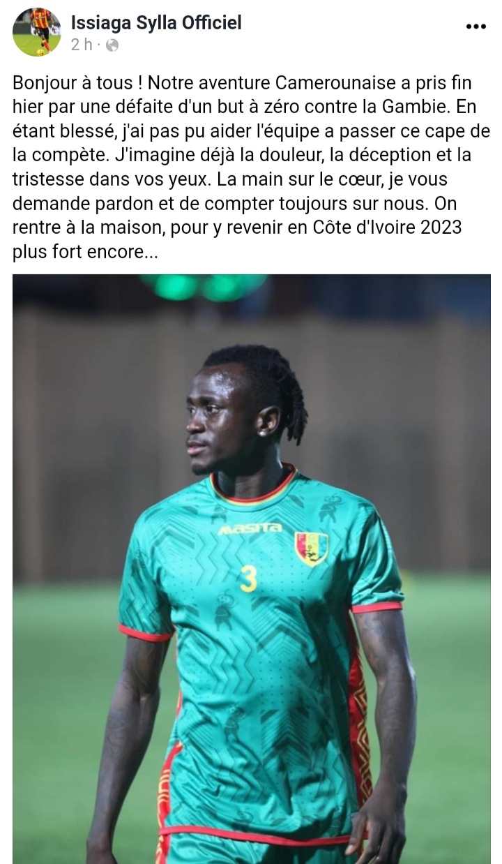 BAFOUSSAM- La CAN de la Guinée a pris fin ce lundi 24 janvier contre l’équipe de Gambie en huitièmes de finale au Cameroun. Le Syli se projette désormais sur la coupe d’Afrique des nations 2023 en Côte d’Ivoire. Après cette triste élimination de la Guinée, certains joueurs ont posté des réactions sur leurs différentes pages.