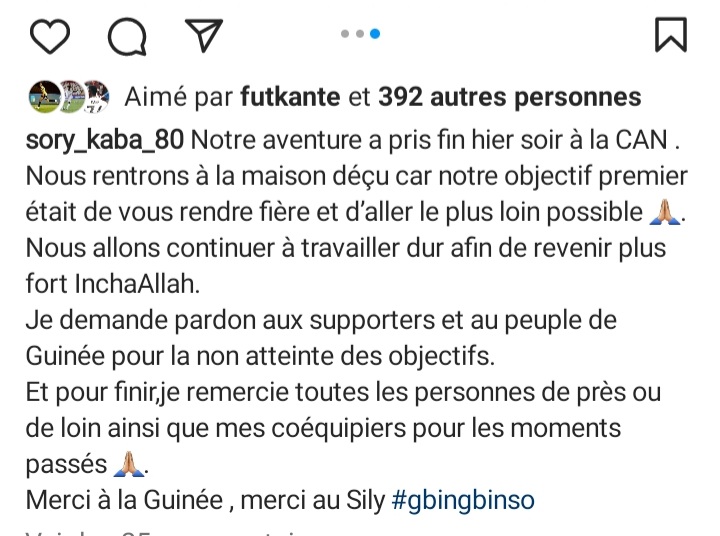 C’est le cas de Sory Kaba, longtemps décrié par les supporters après sa piètre prestation à ce tournoi continental. Dans une publication sur ses canaux de communication, l’attaquant guinéen qui promet de continuer à travailler dur, demande pardon aux guinéens.