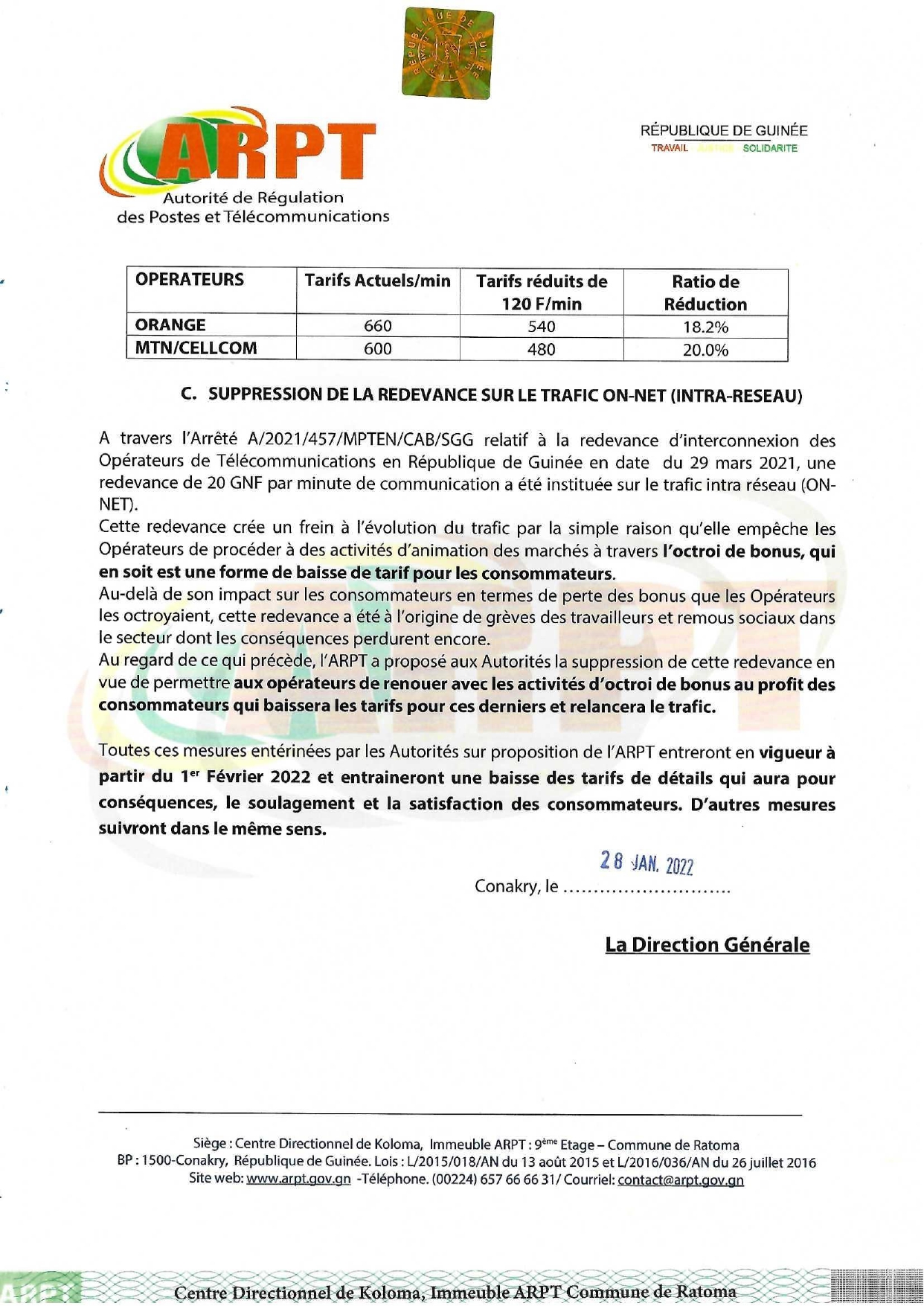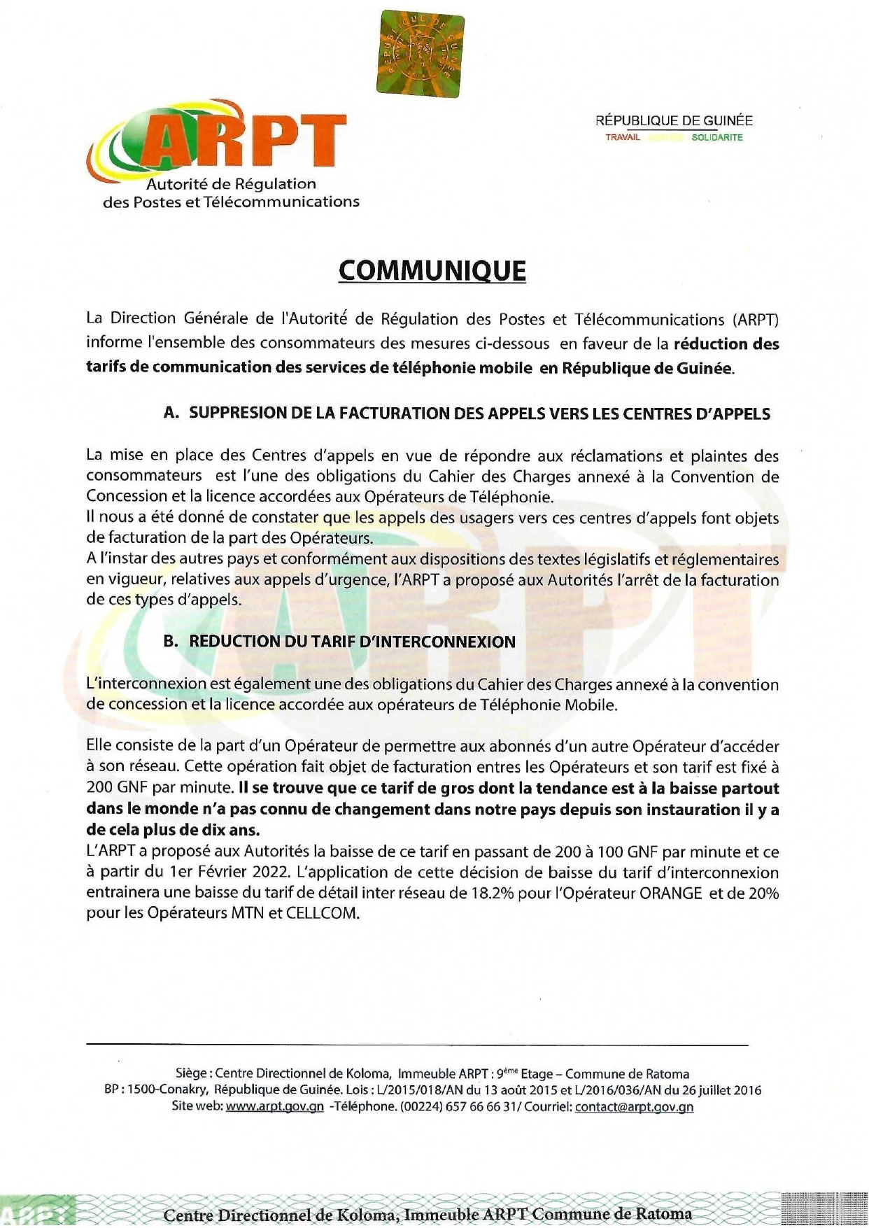 Le directeur général de l’Autorité de régulation des postes et télécommunications (ARPT) Sékou Oumar Barry a signé un important communiqué sur la réduction des tarifs de communication des services de téléphonie mobile en République de Guinée.