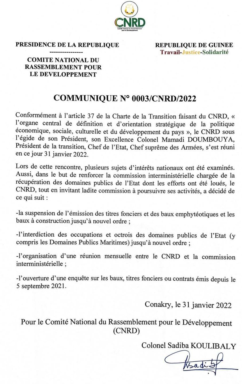 Et ce dernier point intrigue certains observateurs qui se demandent pourquoi les enquêtes partent de la prise du pouvoir par le CNRD ? Est-ce parce que certains membres et non les moindres de la junte sont accusés d’avoir bénéficié des baux ou autres contrats pendant la présidence d’Alpha Condé ? En attendant d’y voir plus clair, lisez ci-dessous le communiqué du CNRD.
