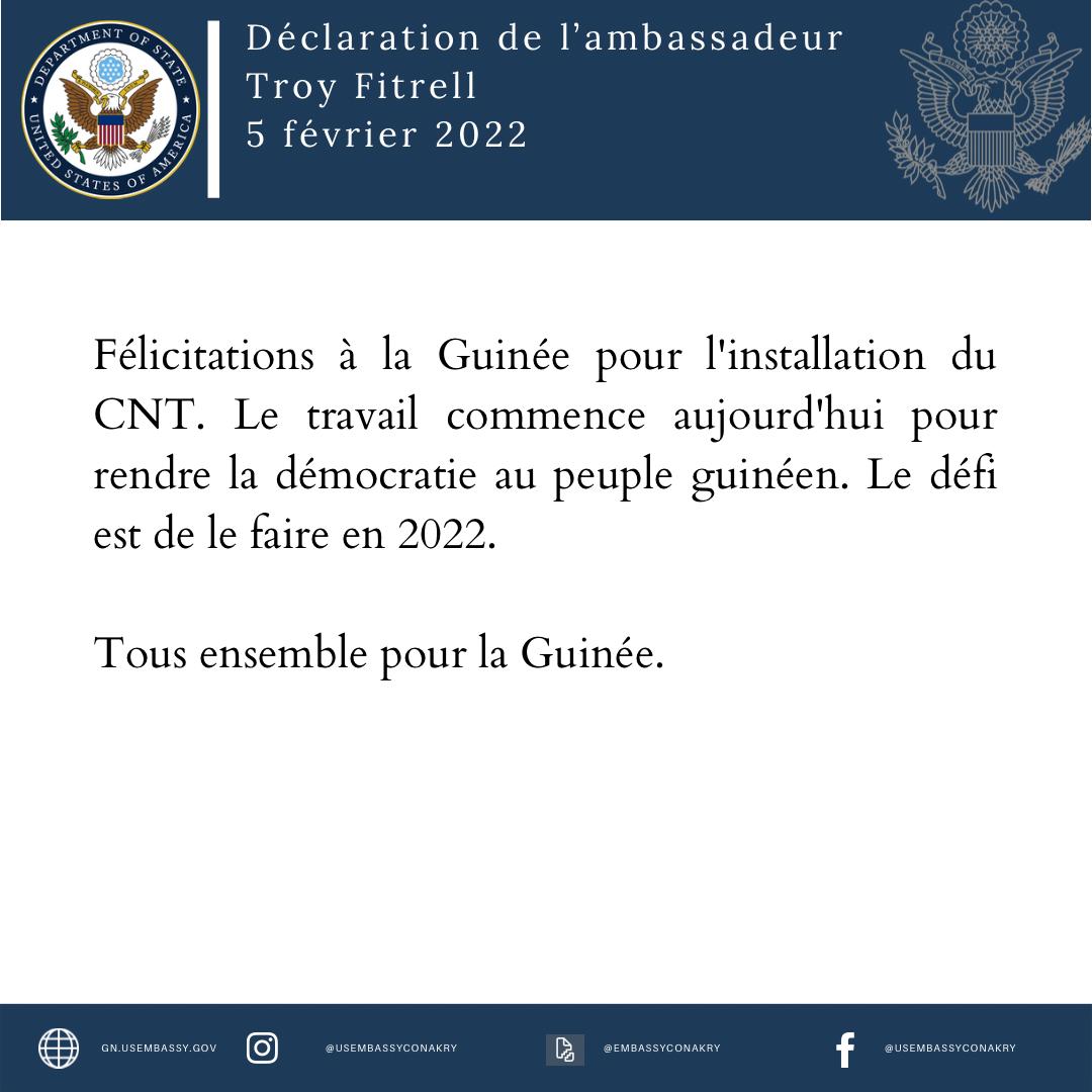 « Le travail commence aujourd’hui pour rendre la démocratie au peuple guinéen. Le défi est de le faire en 2022. Tous ensemble pour la Guinée », a dit le diplomate américain.