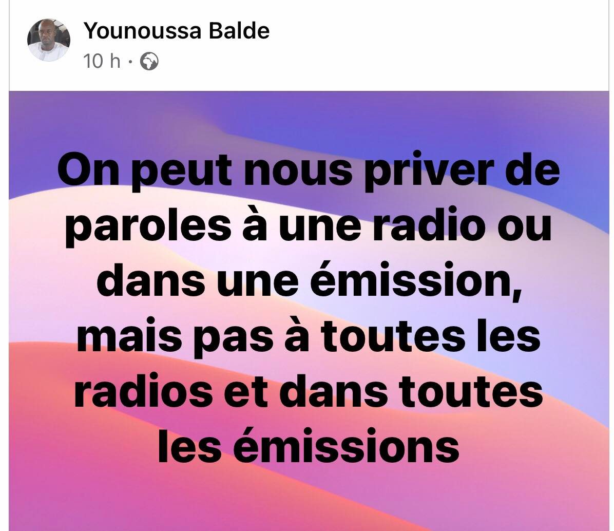 D’abord c’est le général des jeunes Younoussa Baldé lui-même qui donne le ton en écrivant ceci : « On peut nous priver de parole à une radio, ou dans une émission, mais pas à toutes les radios ou dans toutes les émissions. » Il ne se limite pas là, une heure après cette publication, il renchérît « En temps de guerre, on te prie de parler au nom de ton institution, de ton parti ou de ton mouvement ; en temps de paix, on te rappelle les textes qui régissent ton organisation et qui doit parler », écrit-il.